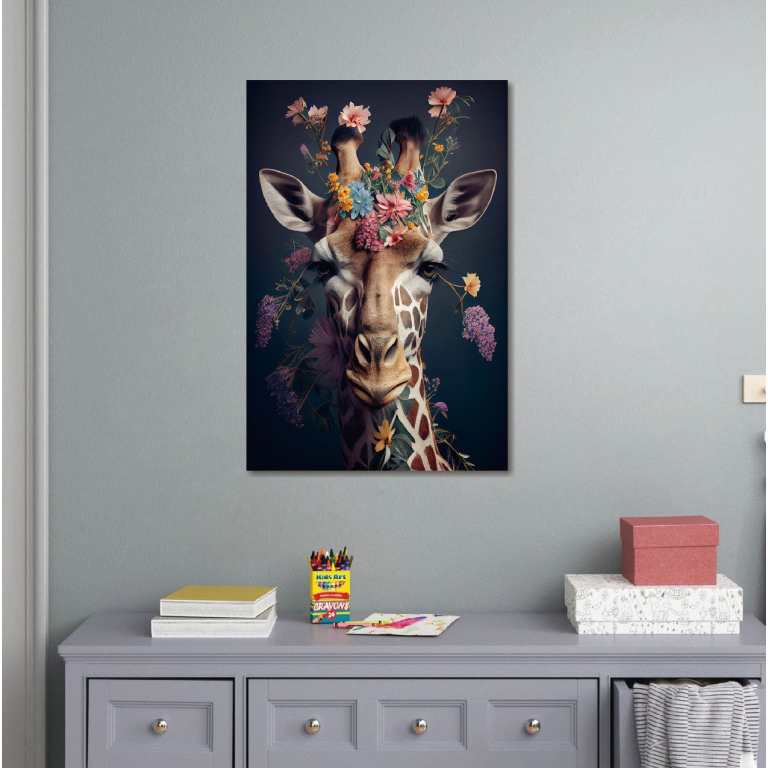 Add a whimsical and artistic touch to your space with the Giraffe with Flowers Wall Art. Measuring 90cm high by 60cm wide, this striking piece features a close-up of a charming giraffe adorned with delicate flowers blending wildlife elegance with playful, boho flair.